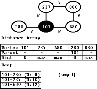 Once we have the source-node, we can can get the ball rolling. The very first step is to add all the edges belonging to the source node to the heap. In this case, with source node as 101, the heap would contain all the three edges: 101-280, 101-237, and 101-680. The heap is a min-heap and the extraction happens based on the weight of these edges. Next, we mark the source node as black -- we are done with it. We provide the graph below showing this first step. The figure also shows the heap and the distance array. The heap contains all the edges that are in consideration. The distance array shows the distance for each node from the source-node and the parent node for each node.