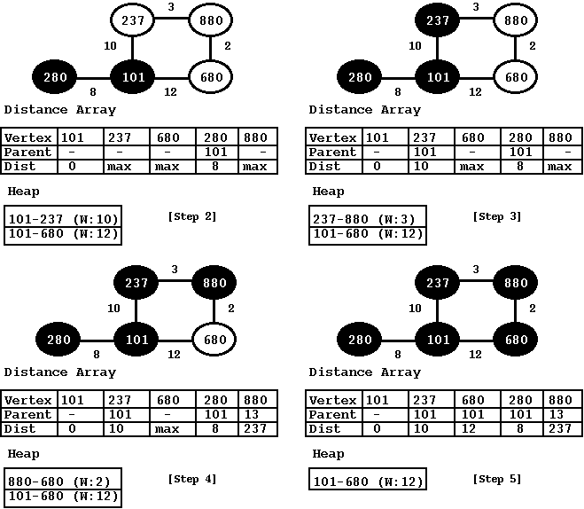 The next set of steps can be added in a while loop. We extract the minimum edge from the heap, add the vertices that are not black and then update the distance array to compute the distance of this vertex to the source node. To do that, we walk all the vertex nodes that are adjacent to the new vertex and for each adjacent vertex node, we recompute the distance of the new vertex to the source node. We select the distance that is the least. Please note that, when walk the list of adjacent vertex nodes, we ignore those vertices that are not yet added to the tree. In this step, then we extract the next node form the heap (101-280). We mark the node 280 since we are done with it. Also, we do not have to add any new edges to heap since 280 has no new edges.