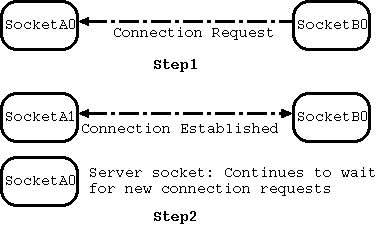 The following figure shows connection establishment in two steps. In the first step, the server socket (socketA0) accepts an incoming connection from a client socket (socketB0). In the second step, the server socket creates a new local socket (socketA1) and associates it with the the client socket. With that, socketA1 and socketB0 now become connected.