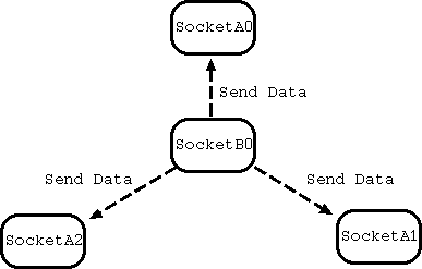 The following figure shows a connectionless client socket (socketB0) sending data to three different server sockets (socketA0, socketA1, and socketA2), all at the same time.