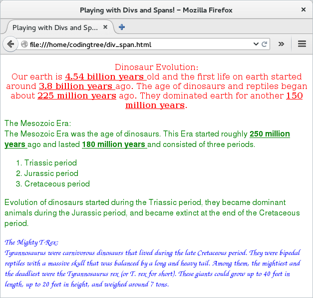 Let us see how we can use <div> and <span> to add value for CSS design. For that, let us create a simple HTML example (provided below). The example contains three sections. For the sake of demonstration, we do not add any div/span yet. Let us now say that we would like to do two things. First, we need to give a different design to each of these three sections. Second, we need to design all the text that are related to time (e.g. "4.54 billion years") using a common style.