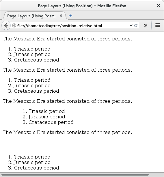 If we load the above HTML file, then we would find that the first two lists appear to be placed identically with respect to the paragraph element. The third list appears to be shifted on the right from its usual position. The last list appears to be shifted down from its usual position.