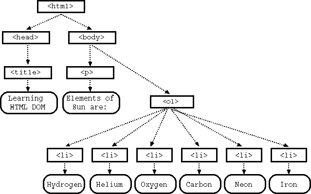 Let us discuss various elements that are present in the above HTML page. Since HTML elements are identified using their tags, we can see that the page has several elements: the HTML element itself (identified by <html> tag), the head element (identified by <head> tag), the title element (identified by the <title> tag), the body element (identified by <body> element), a paragraph element (identified by <p> tag), an ordered list (identified by <ol> tag), and a handful of list items of the ordered list (identified by <li> tag).