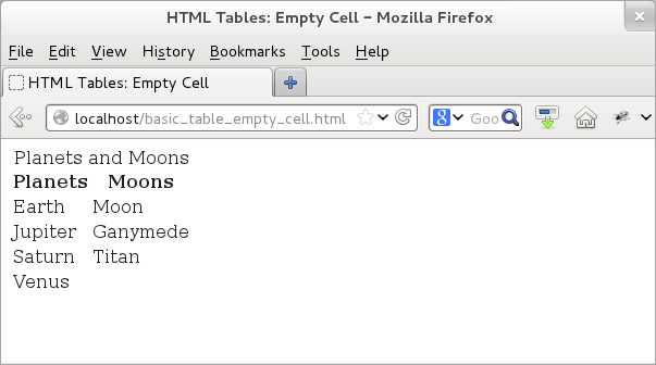There is an implicit relationship between the <tr> and <td> tags -- you would have probably noted that already by now! Since each row of a table has the same number of columns, we should keep the number of table data (<td>) tags same for all rows. Thus, if we were to re-write the above table and keep only one column in the second row, then that would break the structure of the table element. So, even if we do not have any data to put in a cell, we should still put an empty cell.