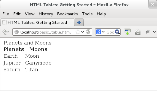In the example (provided below), we have a table that has 4 rows and 2 columns. The first row is the header row and it uses <th> tags instead of <td> tags for table cells. The next three rows are regular rows and use <td> for data cells. Since each row has 2 cells -- this means that the table has 2 columns. In case you are wondering, HTML does not provide any explicit tag for columns! Lastly, the example below also adds a caption to a table. The browser would display this caption as the title of the table. The tag for that task is the <caption> tag. The caption element should be placed immediately after the <table> tag. Needless to say, we should keep only one caption tag in a given table.
