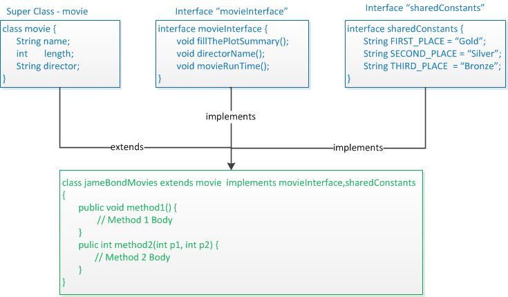 Like a class, an interface can also be extended. All the concepts of inheritance that are applicable to a class are also applicable to an interface. Also, a class can extend one or more classes and also implement one or more interfaces at the same time. Let us see that using the following figure.