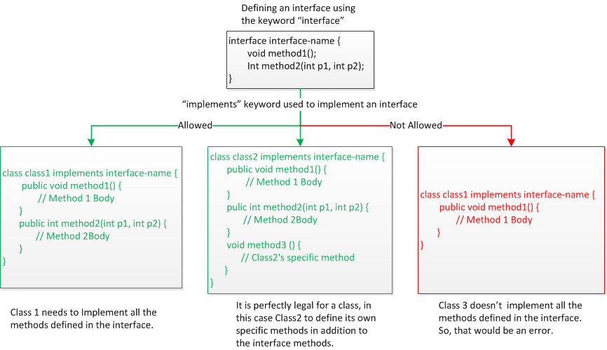 Notice, the keywords used in the below example program. The keyword "interface" is used to define an interface, a class can implement an interface using the keyword "implements". All the methods defined in the class that implements interface, must be defined "public", notice the usage of the access specifier "public" in front of the method definitions.