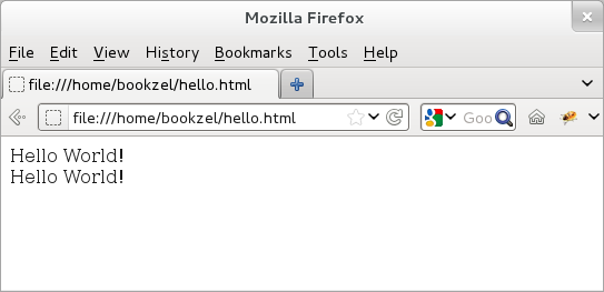 Running the above example is very simple. Simply point the web browser to this location to load this file. Once loaded, the page would display "Hello World!" twice.