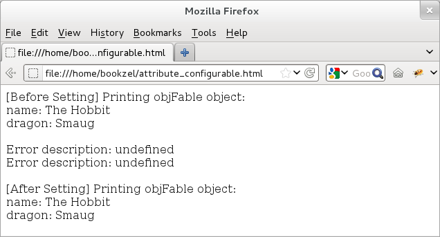 We provide the output of this example below. The output confirms that when we try to configure the writable attribute to true (it is false in the beginning), then JavaScript throws an error since the property is non-configurable. An additional proof that the step of configuring writable to true fails comes when when we try to update the property values. Since the writable attribute was not set to true, the updated values are not reflected when we try to re-print the object.