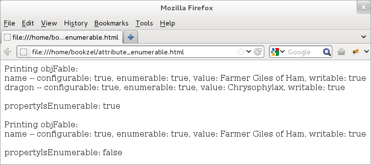The first example focuses on the enumerable attribute of a property. This example shows that if the enumerable attribute is set to false, then the propertyIsEnumerable() method returns false and that property does not show up in a for/in loop.