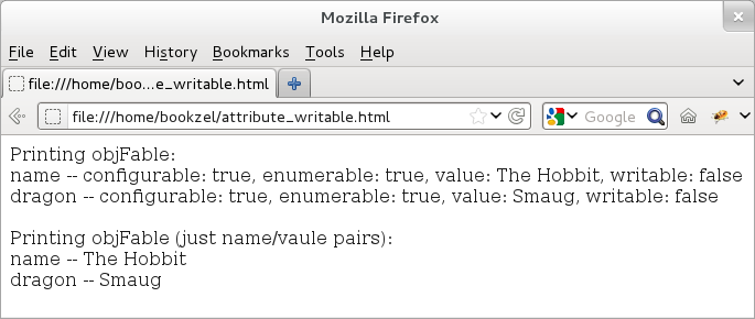 "name": {value: "The Hobbit", writable: false, enumerable: true, configurable: false},