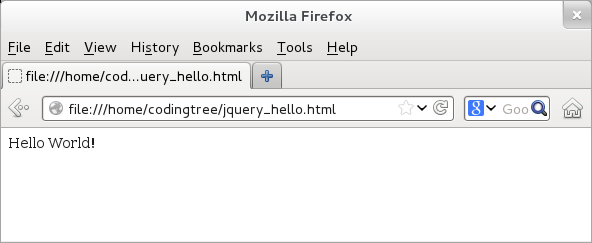 Running the above example is fairly simple. We need to merely point the web browser to the location of the "jquery_hello.html" file and thus, load the file. One the page is loaded, we would see the "Hello World!" text shown below. The bonus is that since jQuery is run using a web browser's built-in JavaScript interpreter, there is no need to compile these programs!
